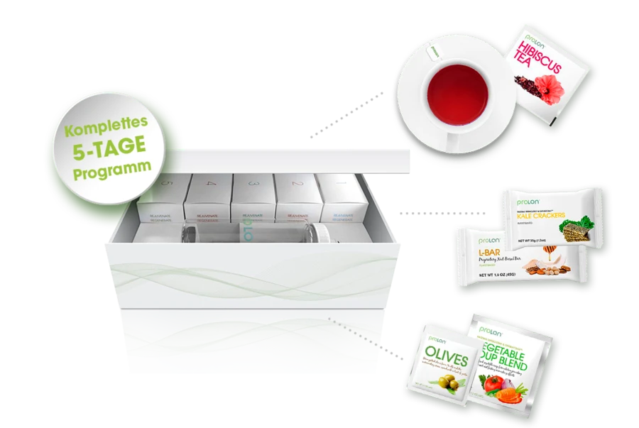 Mit ProLon® hat der Altersforscher Prof. Dr. Valter Longo eine Fastenkur entwickelt, bei der man essen darf. Eine Box enthält alle Lebensmittel und Getränke (außer Wasser), die man für die Dauer des 5-tägigen-Fastenprogramms benötigen. Nummerierte Boxen und eine klare Anleitung führen Tag für Tag einfach zum Ziel.